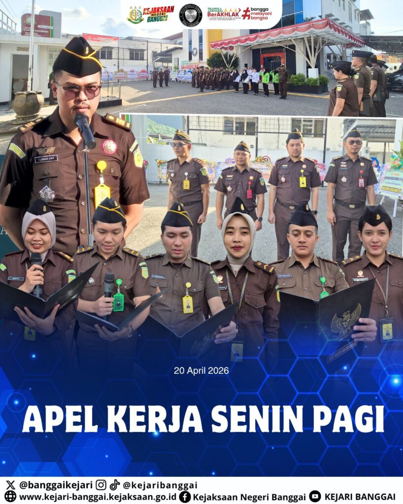 Hari Senin, 20 April 2026 bertempat di Halaman Kantor Kejaksaan Negeri Banggai, Kepala Seksi Perdata dan Tata Usaha Negara memimpin Apel Kerja Senin Pagi yang diikuti oleh Para Kasi, Kasubagbin, Pegawai dan Tenaga Alih Daya (TAD) di lingkungan Kejaksaan Negeri Banggai.