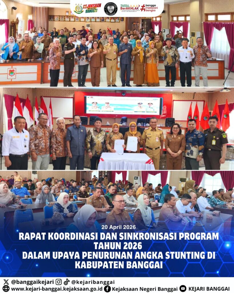 Hari Senin, 20 April 2026 bertempat di Ruang Rapat Umum Kantor Bupati Banggai, Kepala Kejaksaan Negeri Banggai yang diwakili oleh Staff Bidang Perdata dan Tata Usaha Negara mengikuti kegiatan Rapat Koordinasi dan Sinkronisasi Program Tahun 2026 Dalam Upaya Penurunan Angka Stunting di Kabupaten Banggai yang diselenggarakan oleh Pemerintah Kabupaten Banggai.