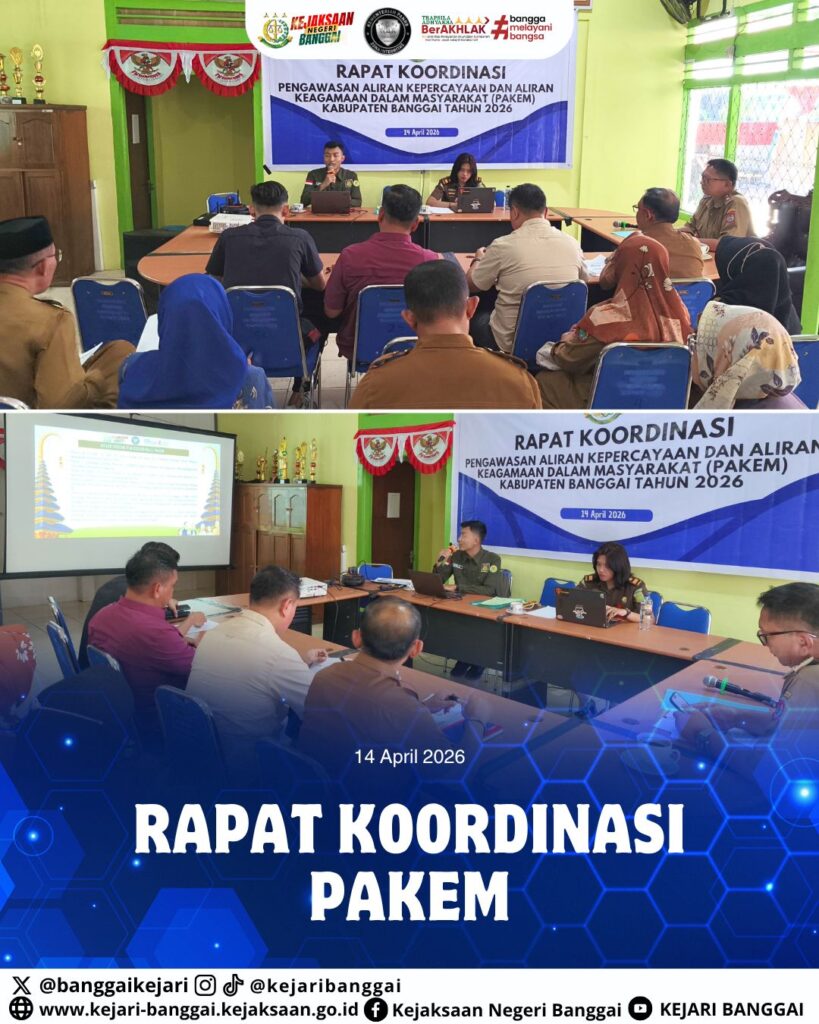 Hari Selasa, 14 April 2026 bertempat di Kantor Badan Kesatuan Bangsa dan Politik Kab. Banggai, telah dilaksanakan Rapat Koordinasi Pengawasan Aliran Kepercayaan dan Keagamaan Dalam Masyarakat (PAKEM), Kepala Sub Seksi II Intelijen Kejaksaan Negeri Banggai menjadi Narasumber pada kegiatan tersebut dengan Tema “Strategi Penguatan Daya Tangkal Aliran Kepercayaan yang Menyimpang”.