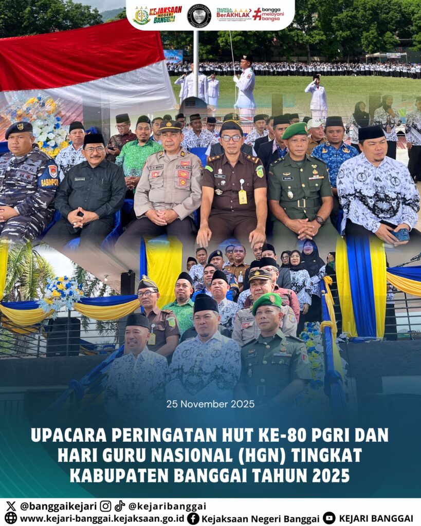 Hari Rabu, 25 November 2025 bertempat di Lapangan Alun-Alun Bumi Mutiara Luwuk, Kepala Kejaksaan Negeri Banggai yang diwakili oleh Kepala Sub Bagian Pembinaan menghadiri kegiatan Upacara Peringatan HUT Ke-80 PGRI dan Hari Guru Nasional (HGN) Tingkat Kabupaten Banggai Tahun 2025.